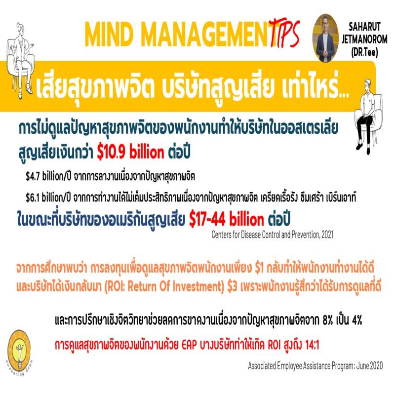 จากการศึกษาพบว่า การลงทุนเพื่อดูแลสุขภาพจิตพนักงานเพียง $1 กลับทำให้พนักงานทำงานได้ดีและบริษัทได้เงินกลับมา (ROI: Return Of Investment) $3 เพราะพนักงานรู้สึกว่าได้รับการดูแลที่ดี